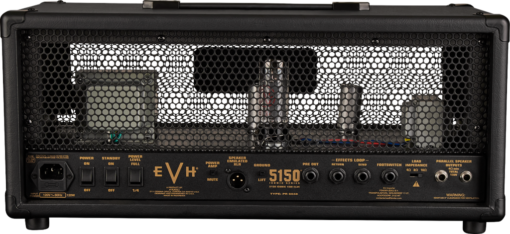 Otras características incluyen un pedal de dos botones, bucle de efectos, dos salidas de altavoz en paralelo, un interruptor de potencia de ¼ para reducir la potencia (lo que permite subir el volumen del amplificador y conservar el tono sin molestar a los vecinos) y una salida DI XLR con emulación de altavoz y función de silencio para la etapa de potencia, para un auténtico sonido EVH a válvulas, ideal para grabar directamente o usar con cualquier sistema de PA. Con el sofisticado y distintivo estilo EVH, el cabezal 5150 Iconic Series de 15 vatios está revestido en vinilo texturizado negro, con un panel frontal de aluminio anodizado dorado cepillado y una rejilla de acero negra con los logotipos 5150 y EVH en dorado y negro. Este cabezal a válvulas se completa con un panel de control de aluminio anodizado dorado cepillado, perillas tipo "cabeza de pollo" de estilo vintage y un asa superior de plástico negro moldeado.
