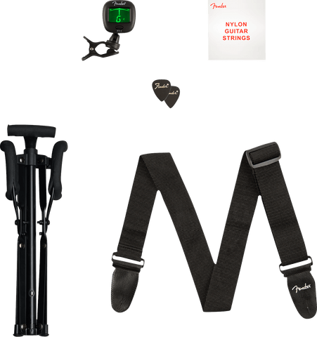 El paquete de inicio Fender Acoustic también incluye funda de transporte, correa, púas, afinador de clip, soporte para guitarra y un juego de cuerdas adicional.