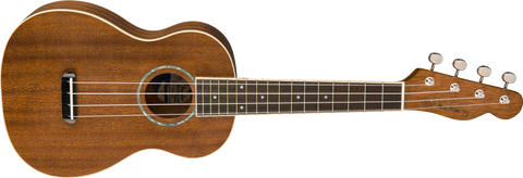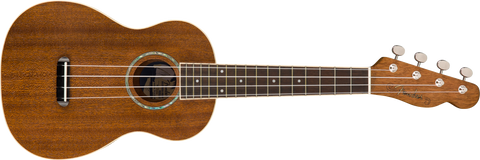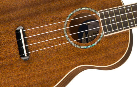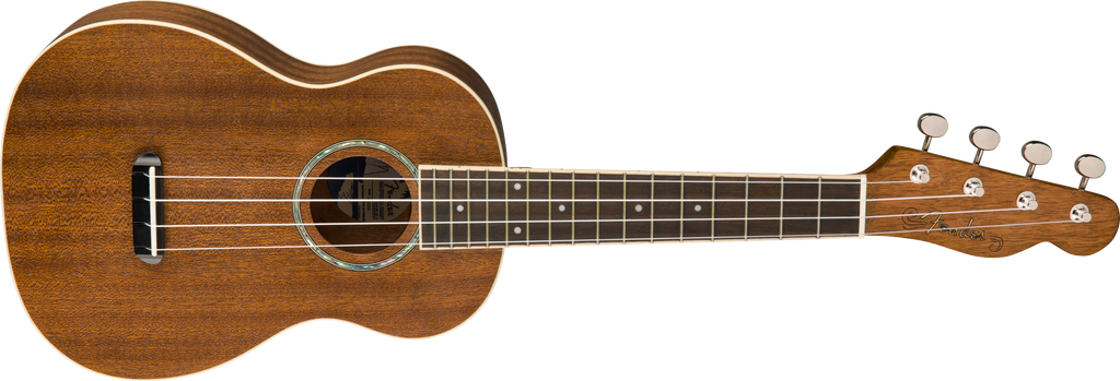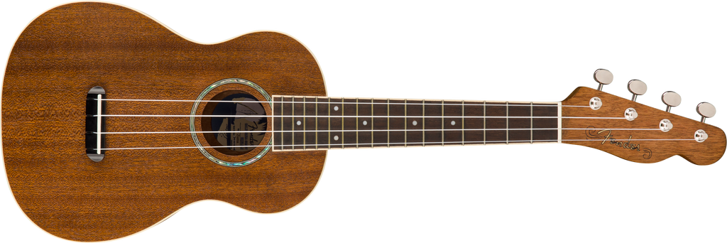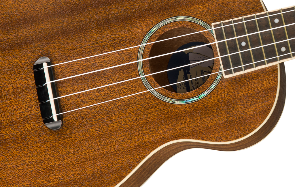 La Zuma se sitúa entre las guitarras soprano más pequeñas y las tenor más grandes, ofreciendo un sonido pleno y una experiencia de interpretación cómoda para músicos con manos grandes. El mástil de 16 trastes, fácil de tocar, amplía el registro, mientras que el puente sin ataduras facilita y agiliza el cambio de cuerdas. Una llamativa roseta de abulón, tapa, fondo y diapasón ribeteados y un clavijero Tele® de 4 en línea destacan entre la multitud con un toque Fender.