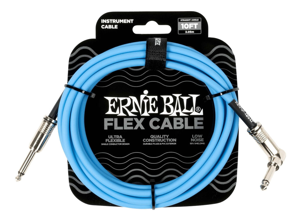 El cable flexible para instrumento Ernie Ball 6464, recto/angulado, 3 m, azul, presenta un diseño de alta calidad fabricado con componentes superiores para una larga duración. Sus conductores dobles ofrecen un sonido claro y confiable con agudos nítidos, medios definidos y armónicos ricos. Sus múltiples materiales de blindaje preservan la señal con bajo ruido de manejo, y su revestimiento exterior trenzado proporciona una experiencia antienredos.